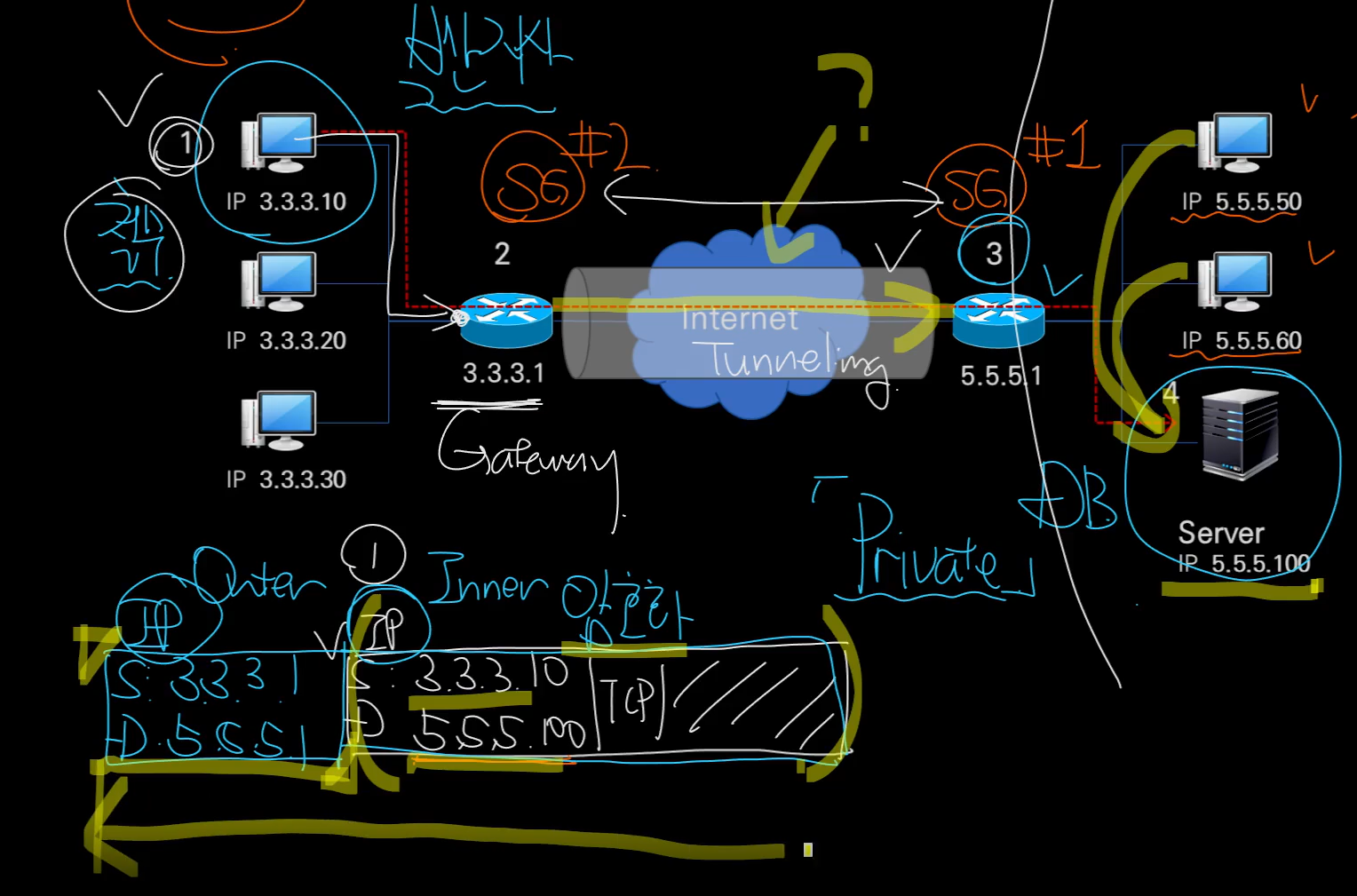 ip 3.3.3.10에서 패킷을 만들어서 3.3.3.1 gw 로 가게 되면 destination 5.5.5.100을 알아보고 암호화를 시킨뒤에 자신과 연결된 SG ip를 기준으로 새롭게 ip header를 만들어서 씌운다.