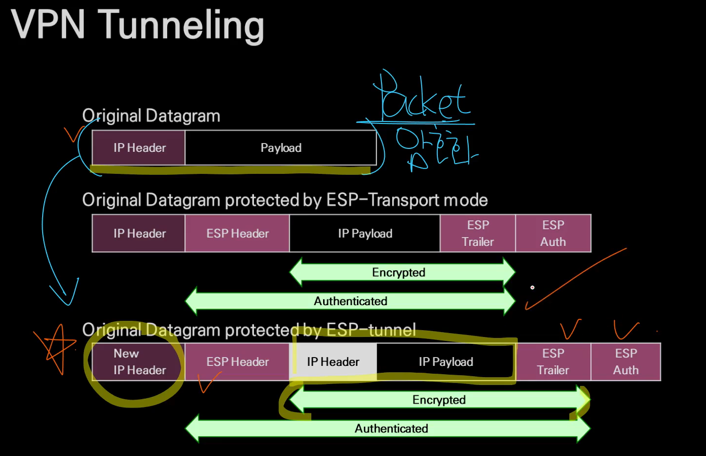 암호화 되어 있으니 중간에 누가 가로채도 알아 볼 수 가 없다. IP 는 패킷이 전달은 되어야 하기 때문에 새로 붙는다.