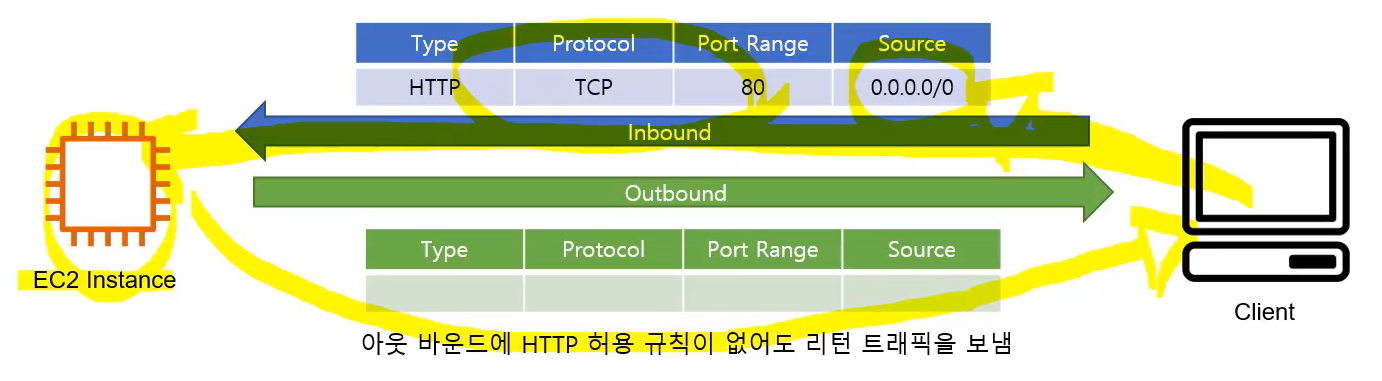 사용자가 인스턴스에서 요청을 전송하면 해당 요청의 응답 트래픽은 인바운드 보안 그룹 규칙에 관계없이 인바운드 흐름이 허용