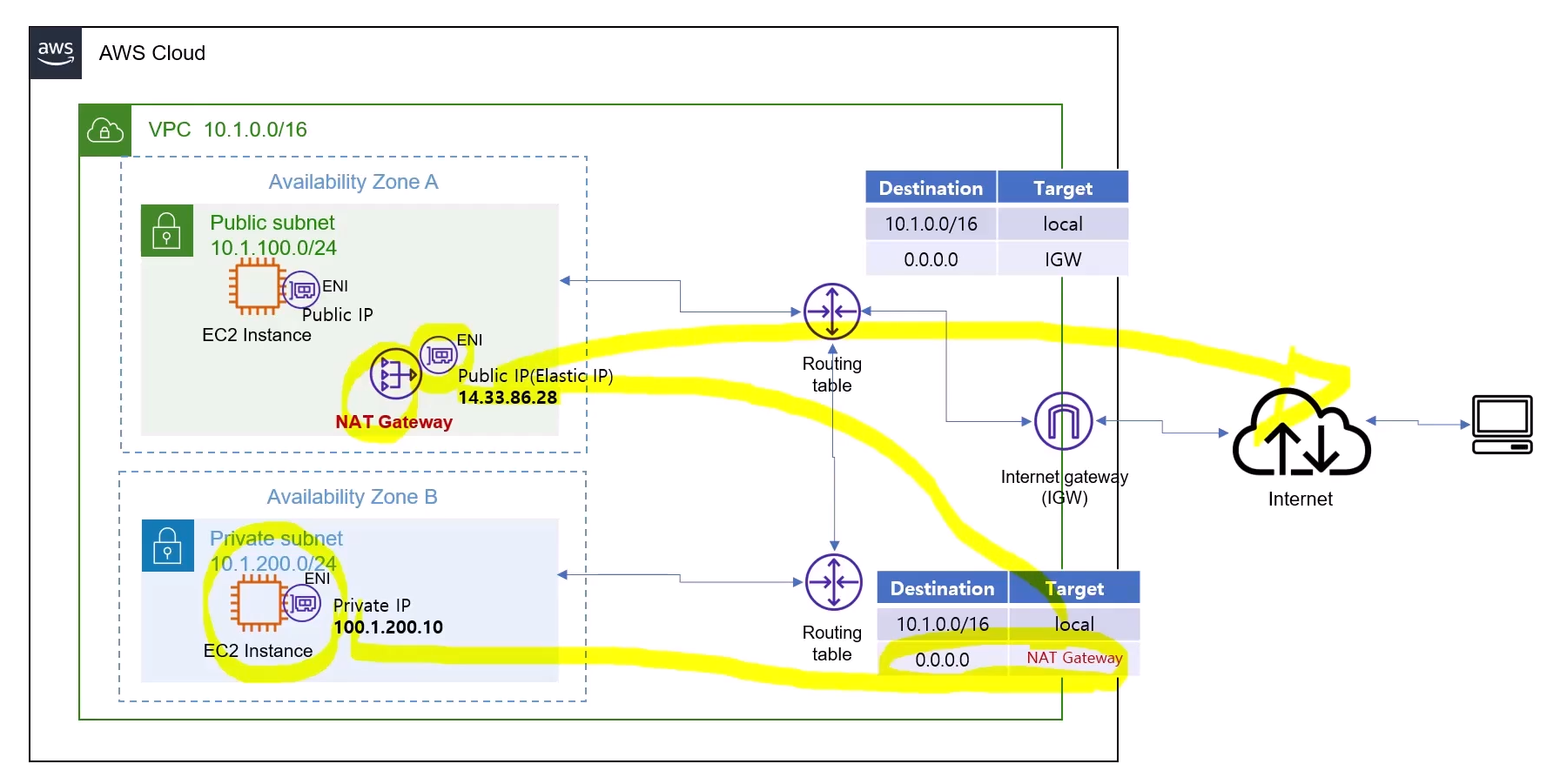 - gw 생성시 Elastic IP를 지정해서 public ip 로 사용되게끔 한다.
