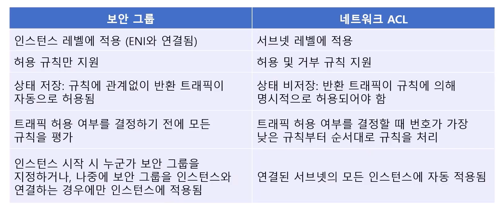 - 보안그룹은 허용 규칙만 지정하고 거부 규칙은 지정할 수 없음