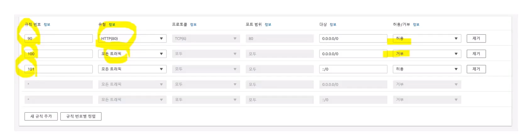 - 예) 90번이 먼저 적용되서 80은 허용 , 100번에서 80을 제외한 모든 트래픽이 거부가된다.