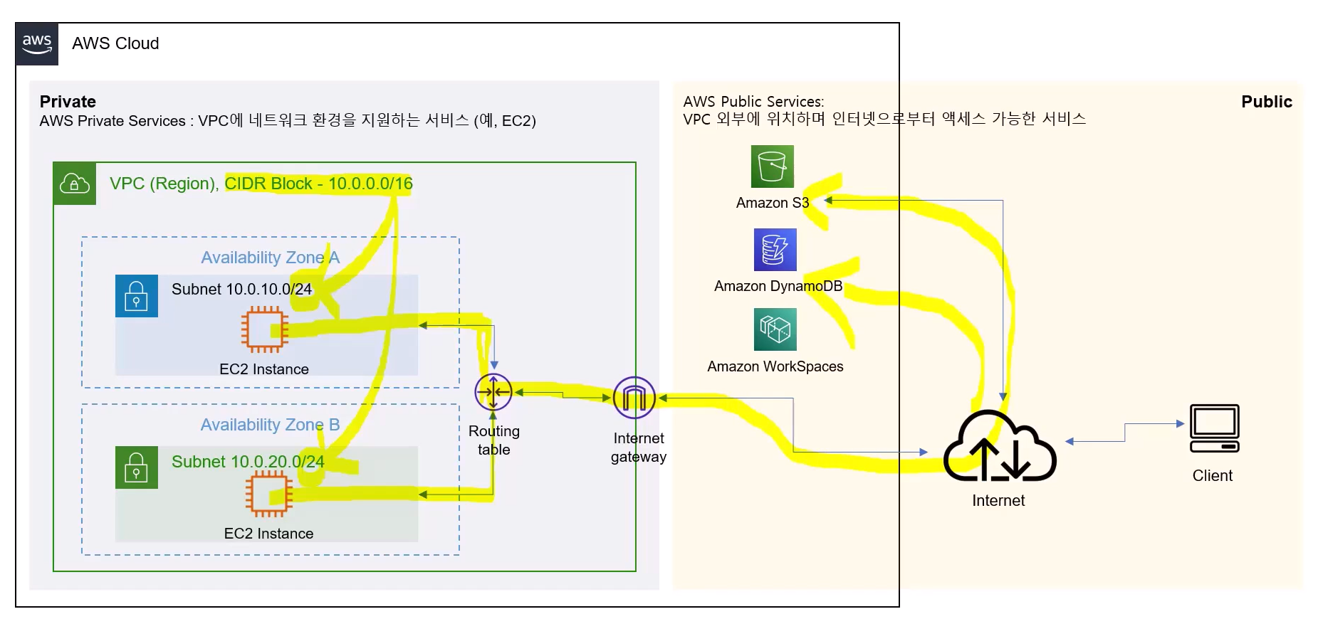 - s3 ,dynamodb 같은 것들은 public 에 위치해서 바깥의 인터넷과 연결되어 있다.