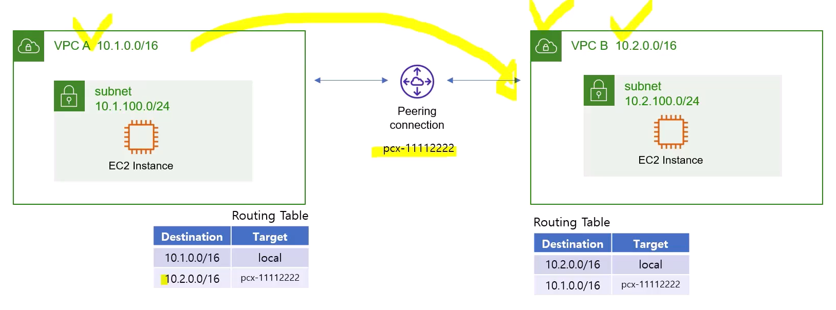 - VPC 간에는 기본적으로 네트워크 통신이 되지 않음
