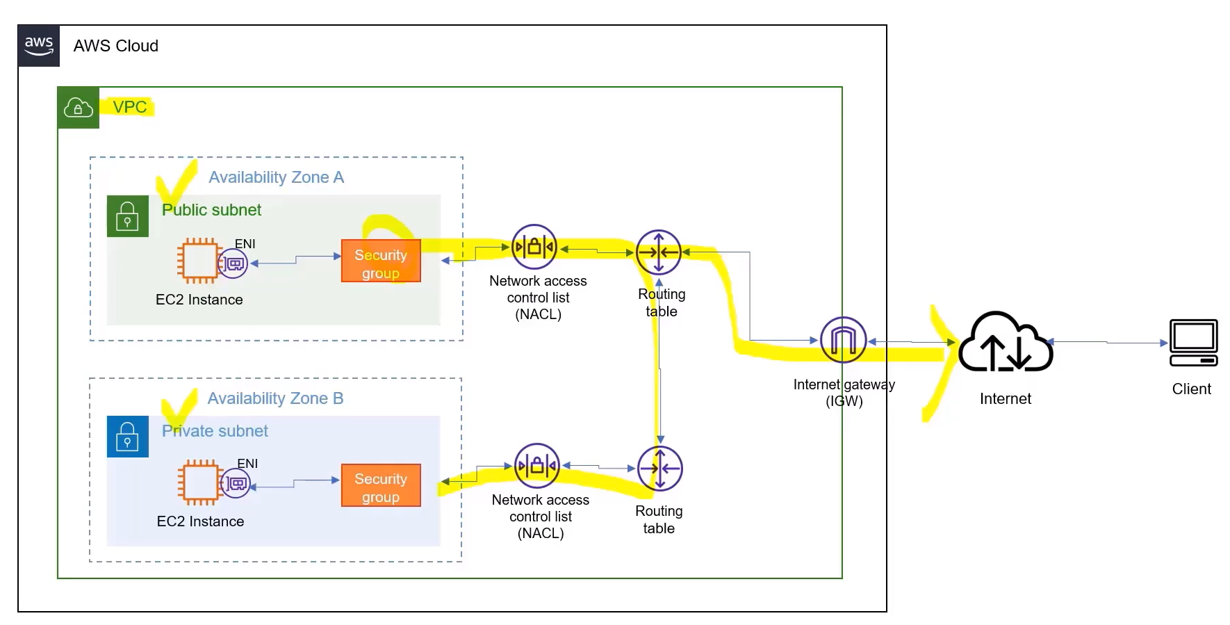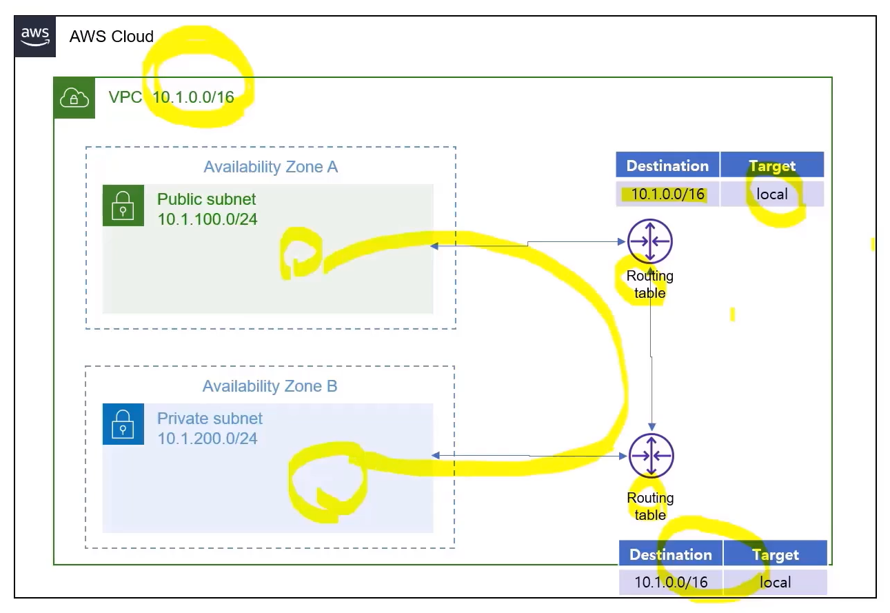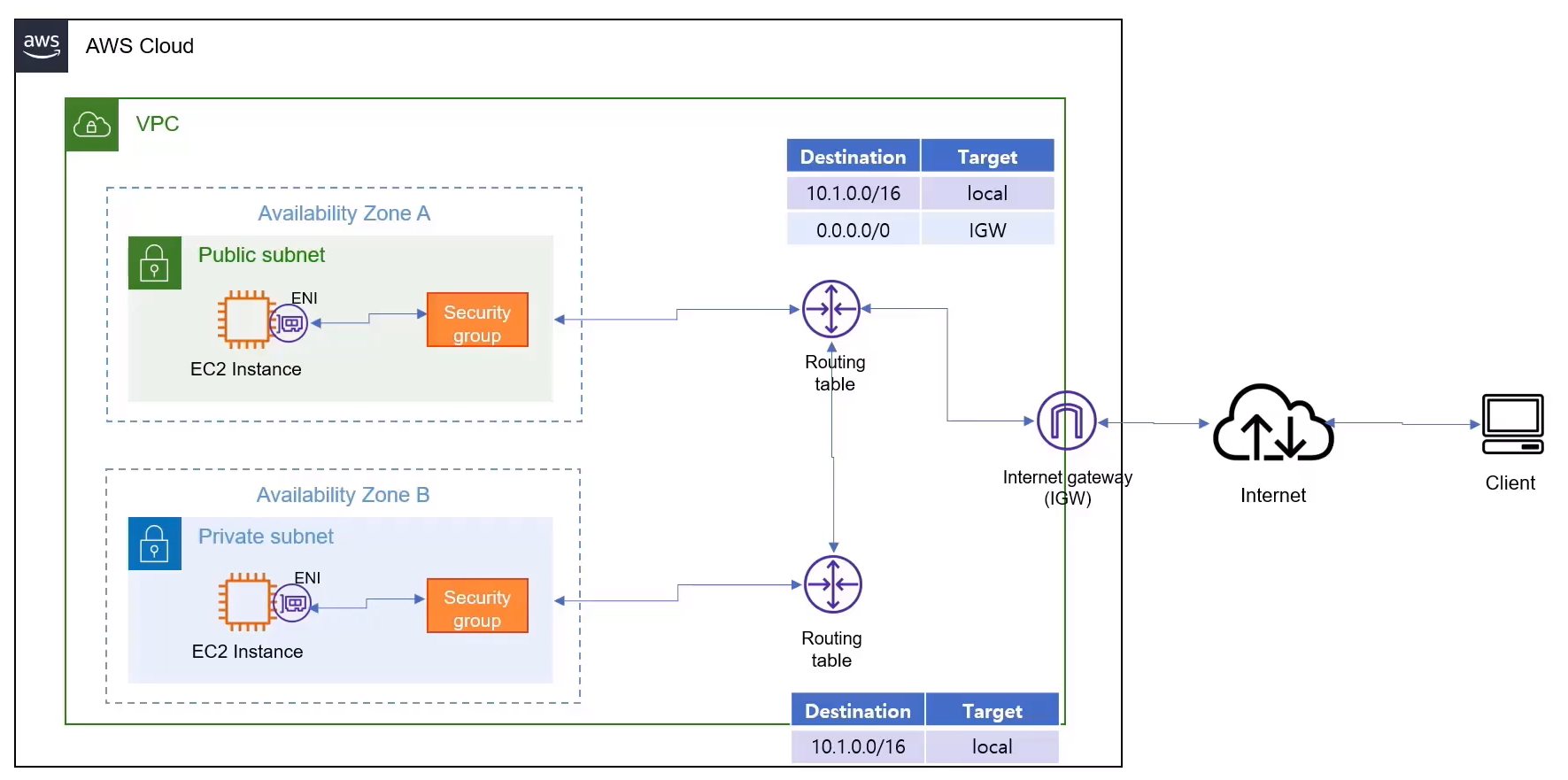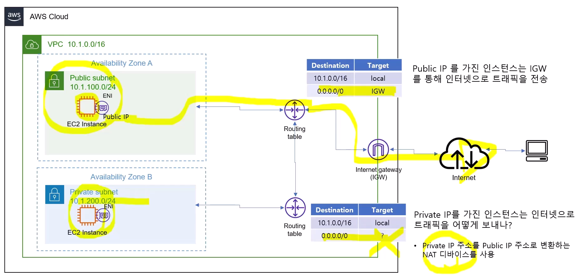 - VPC 대역안의 모든 ip들은 라우팅 테이블을 통해 서로다른 AZ에서도 통신이 가능하다.
