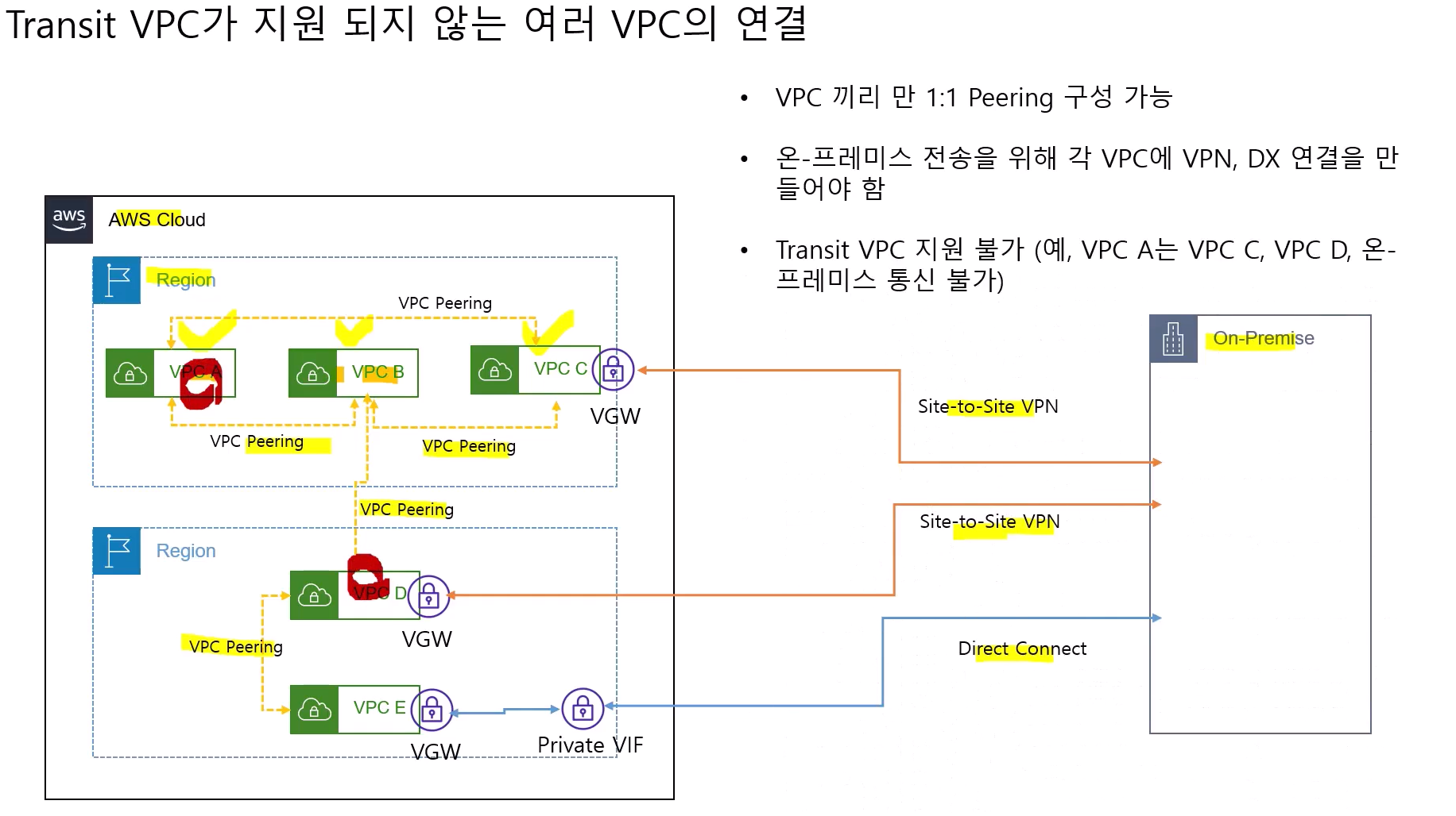 VPC + On Premise 끼리 소통을 원한다면 굉장히 복잡한 구성방식이 필요하다.