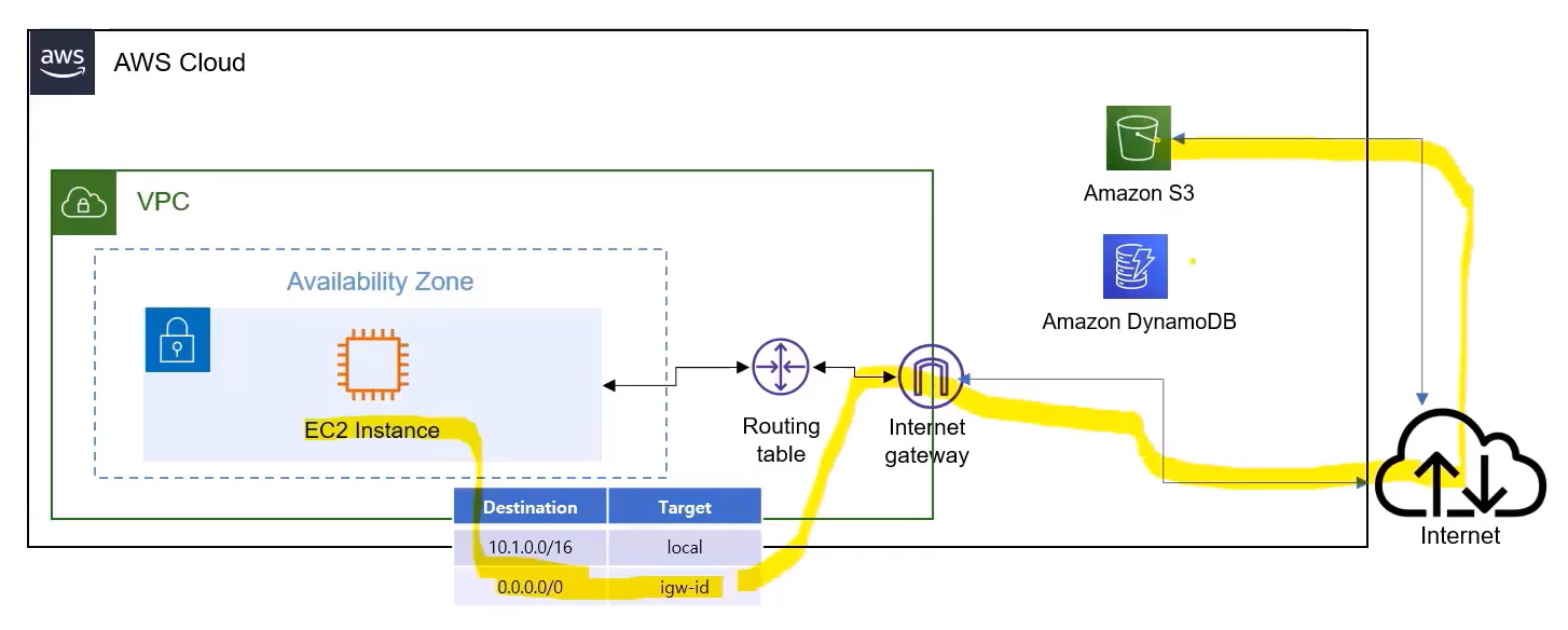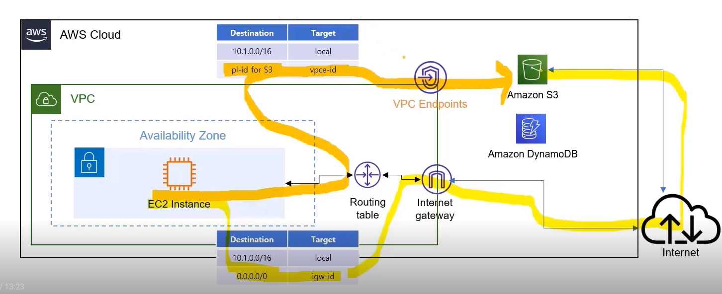 public aws service(S3) 에 접근하기 위해 routing table에 internet gateway 를 거쳐서 인터넷을 거쳐 s3에 접근한다.