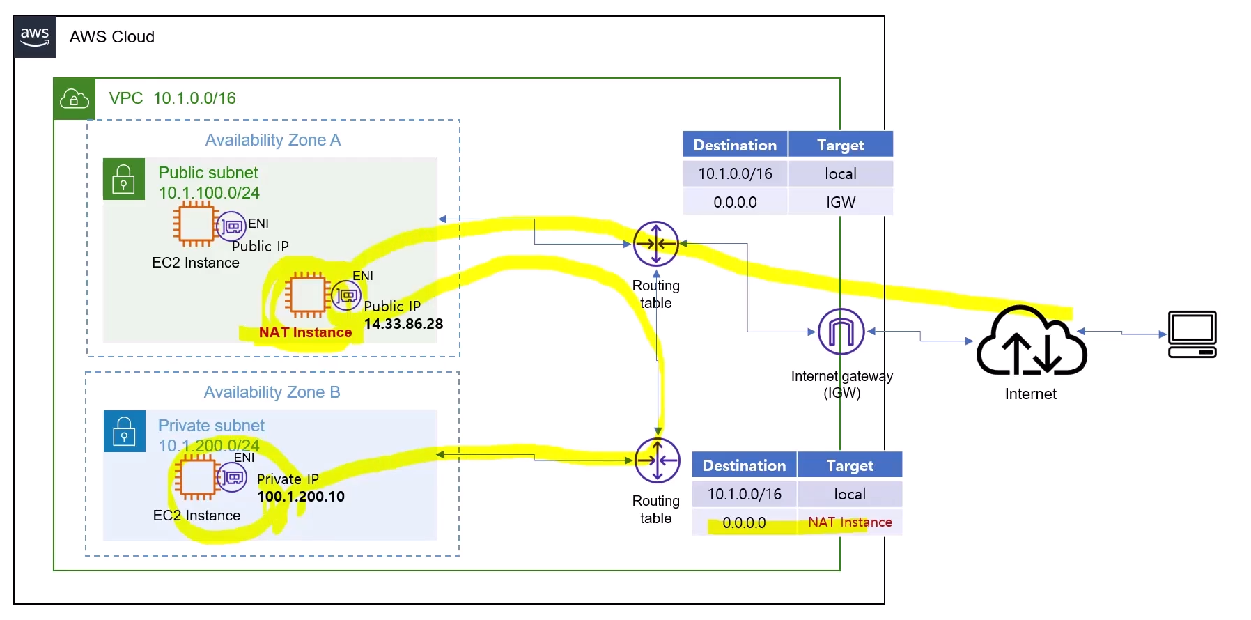 - EC2 인스턴에 NAT 기능을 설치하는 방법이다. B존에서 출발한 트래픽이 public ip를 가진 NAT instance를 통과해서 인터넷으로 뿌린다.
