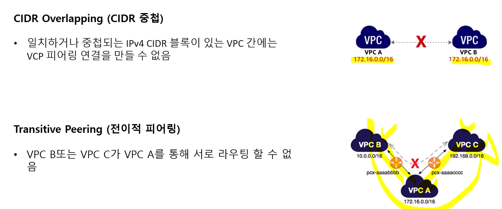 - VPC 피어링은 같은 리전 내에, 다른 리전 간, 다른 AWS 계정간 가능