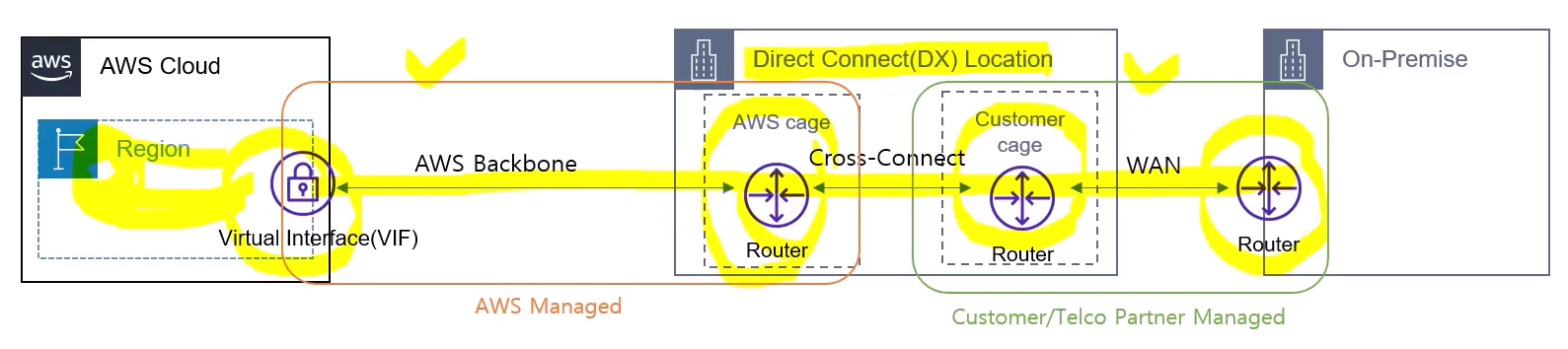 - AWS와 온프레미스 간에 DX(Direct Connect) Location 을 통한 전용선을 통해 프라이빗 네트워크 연결 생성