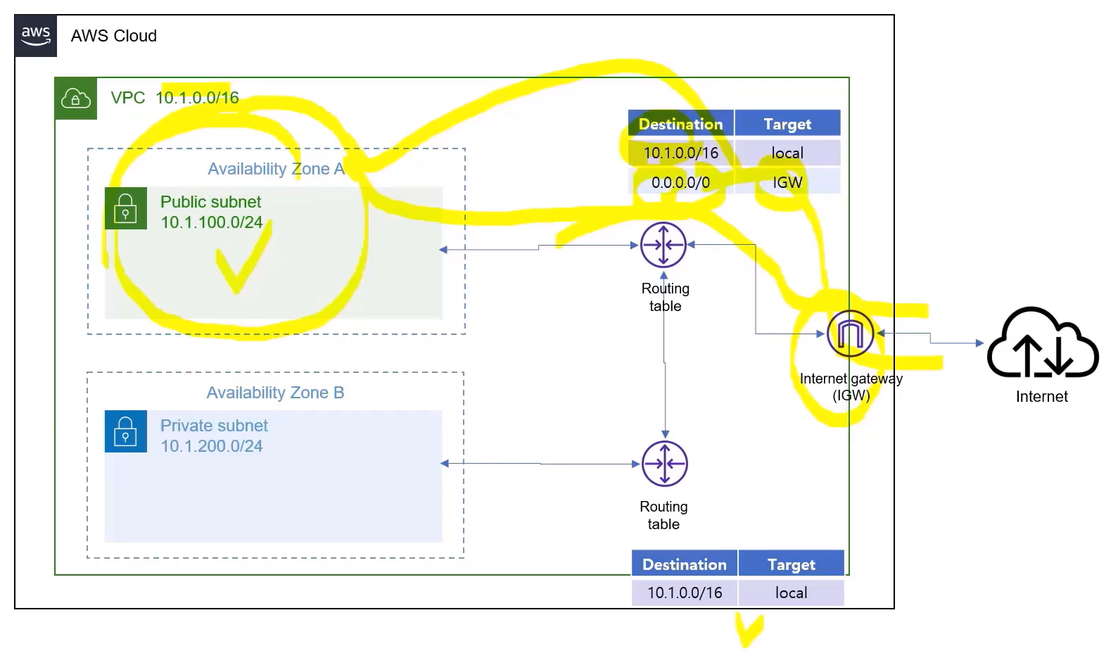 internet gateway를 거쳐서 나가 접속이 가능하다. - routing table을 통해서 각 AZ의 EC2끼리 소통이 가능하다.