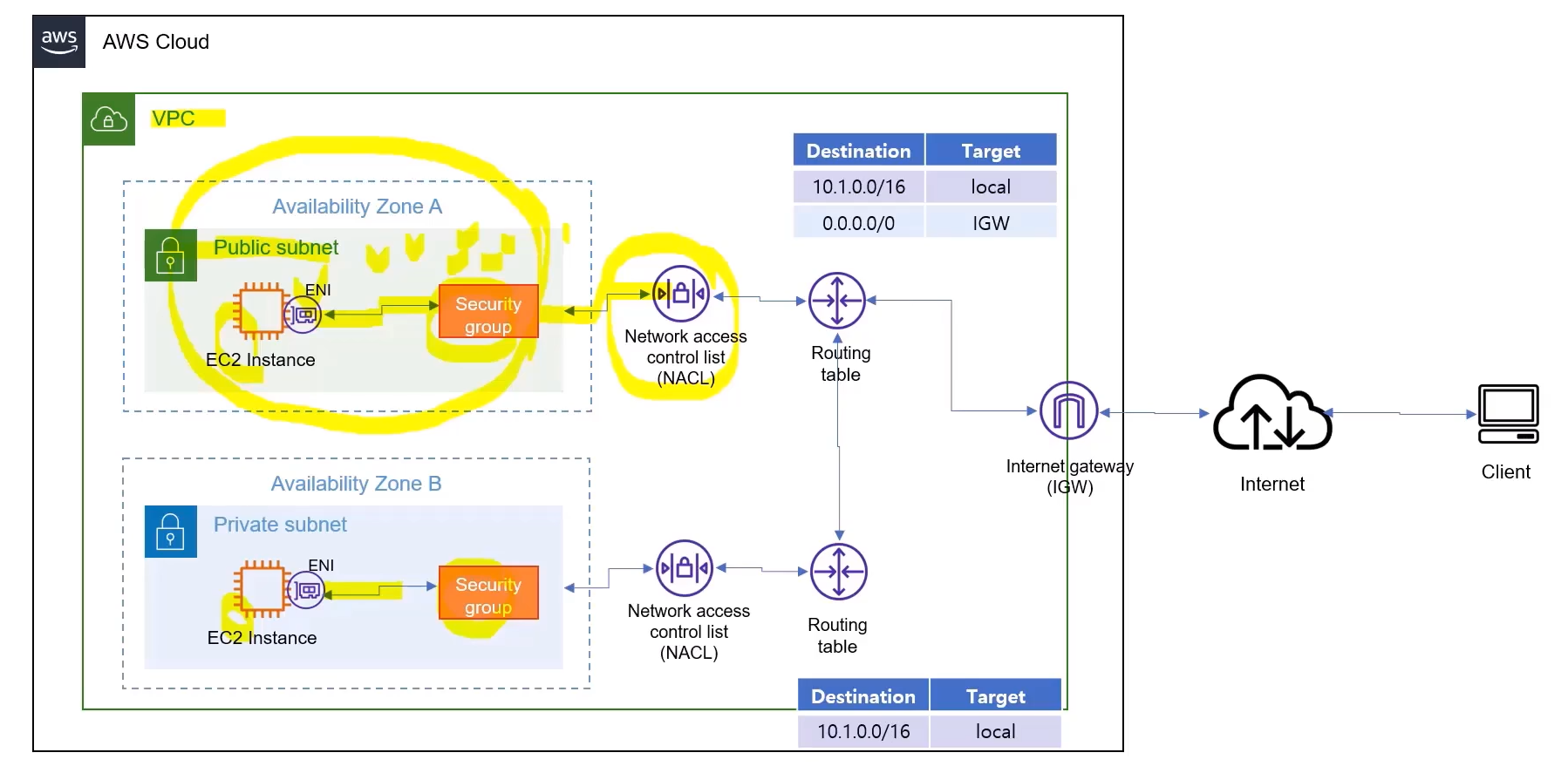 - Security Group은 개별 instance에 대한 방화벽 이었다면 NACL은 각 서브넷에 대한 방화벽이다.