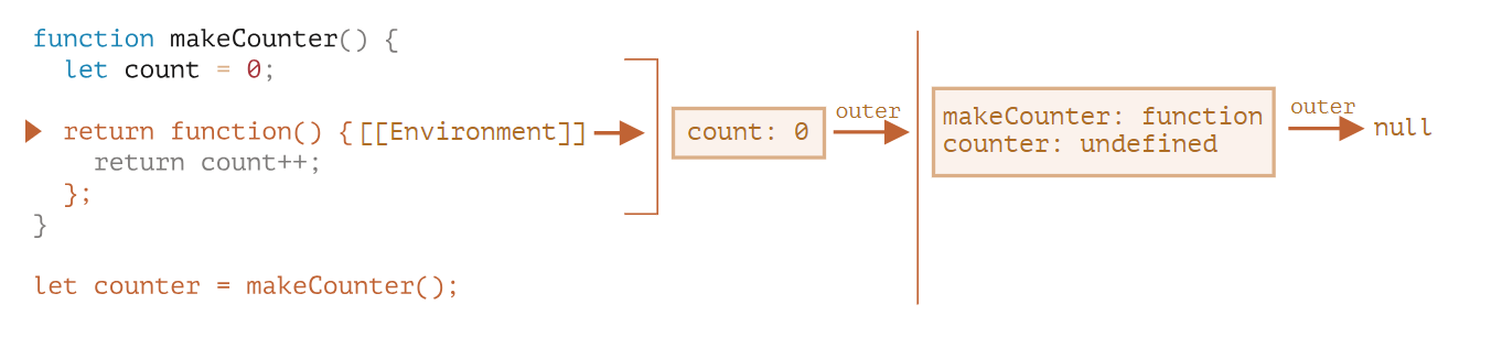 get도 마찬가지로 내부함수로 선언되는 순간에 Environment에 현재 lexical scope인 value == 0이 저장이 된다.