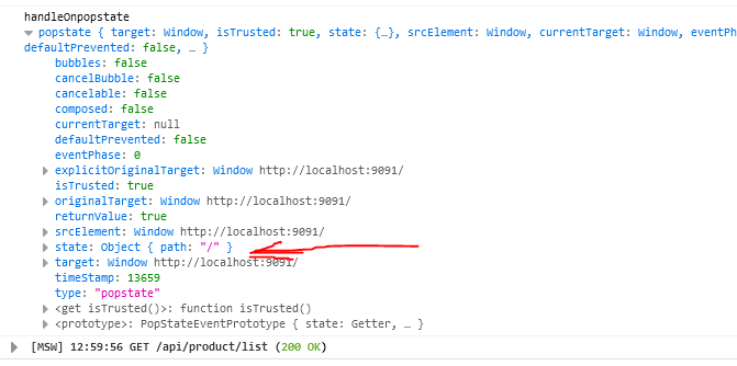 뒤로가기 ,앞으로가기 눌렀을 때 popstate event가 발행이된다. 이때 popstate event에 path "/"가 들어있으니 이를 통해 event handler로 등록한handleOnpopstate를 통해서 Router의 state가 변경이되고