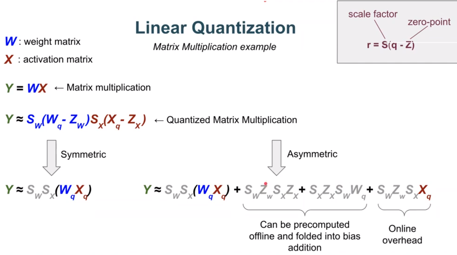 to eliminate online overhead, we can use symmetric quantization only for weights , which makes Zw == 0