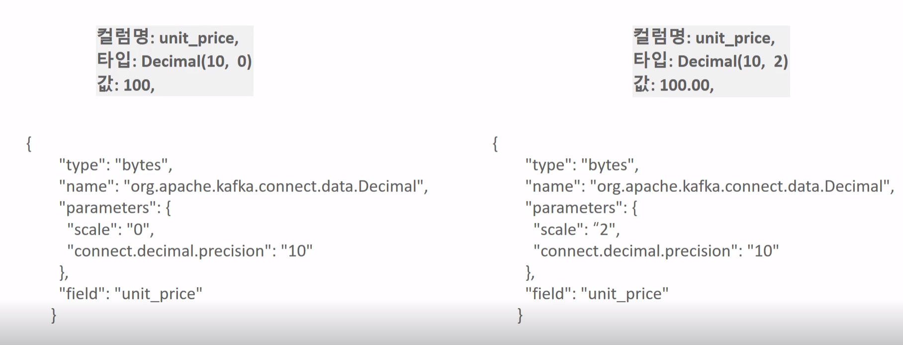 - org.apache.kafka.connect.data.Decimal을 이용하여 변환되며 schema에 parameters로 scale과 precsion값을 표현한다.