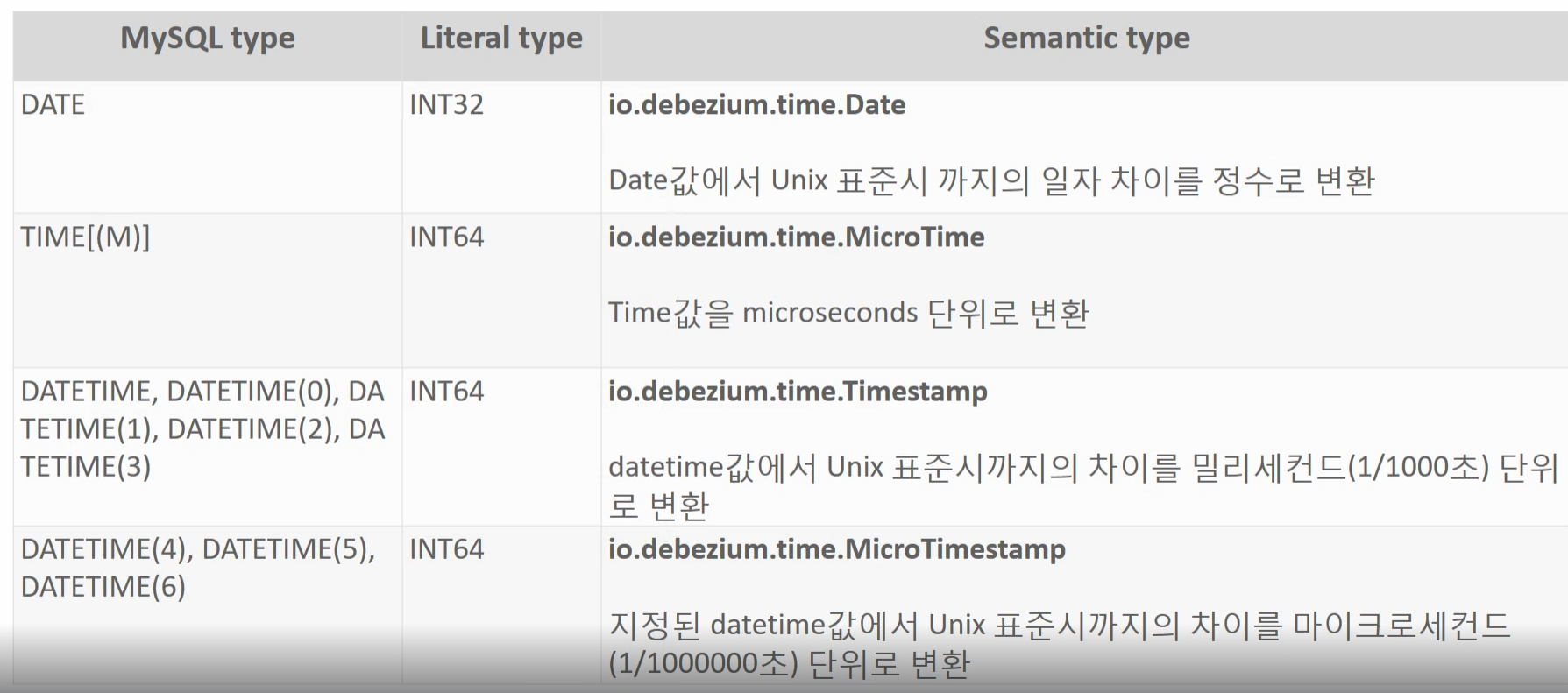 - 때문에 date / time / datetime 변환을 위해서는 Debezium Source connector에서 time.precision.mode = connect로 반드시 설정해야한다.