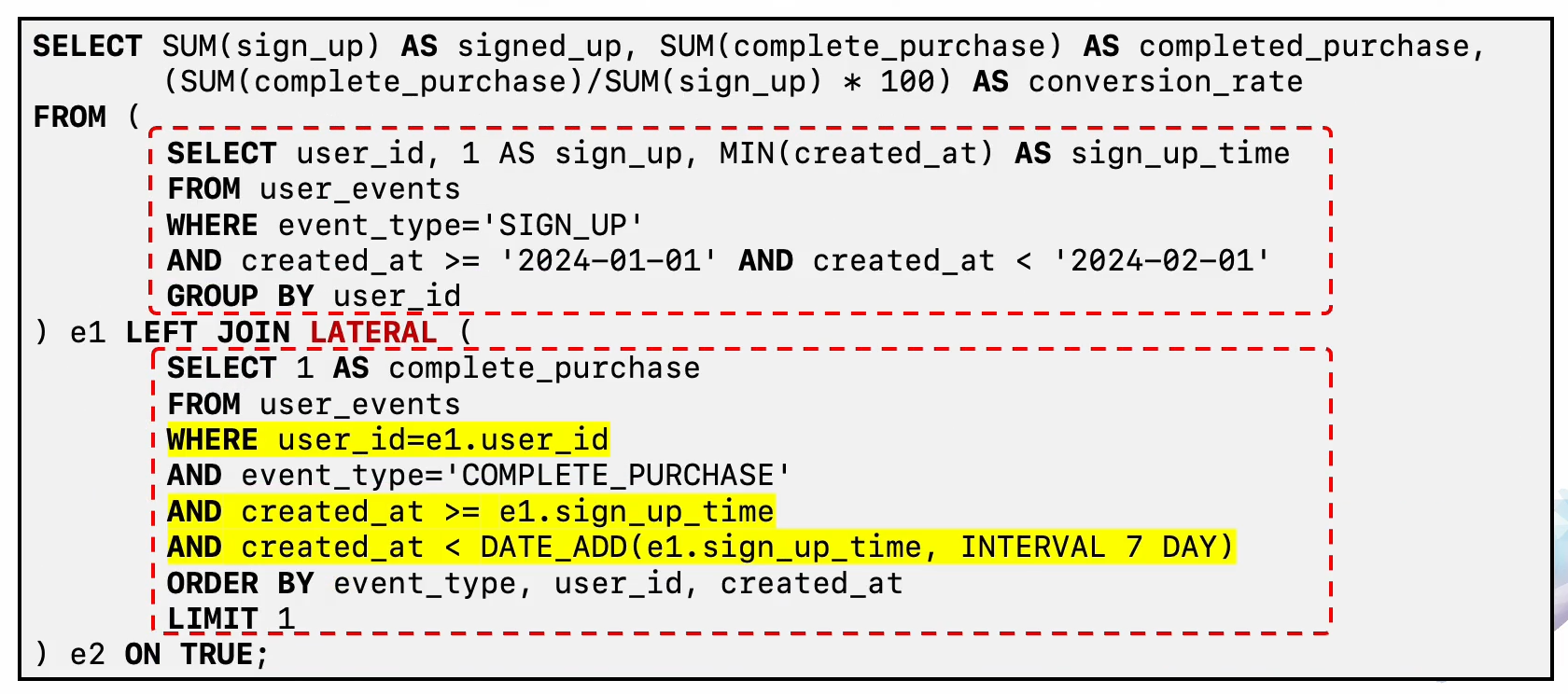 2번째 derived table이 비효율적인데 user_events table에서 결제에 해당하는 전체의 데이터들에대한 group by를 수행하기 떄문이다. 즉 분석 대상이 아닌 1월에 가입한 사용자들말고도 다른애들까지 포함이 되기 때문이다.