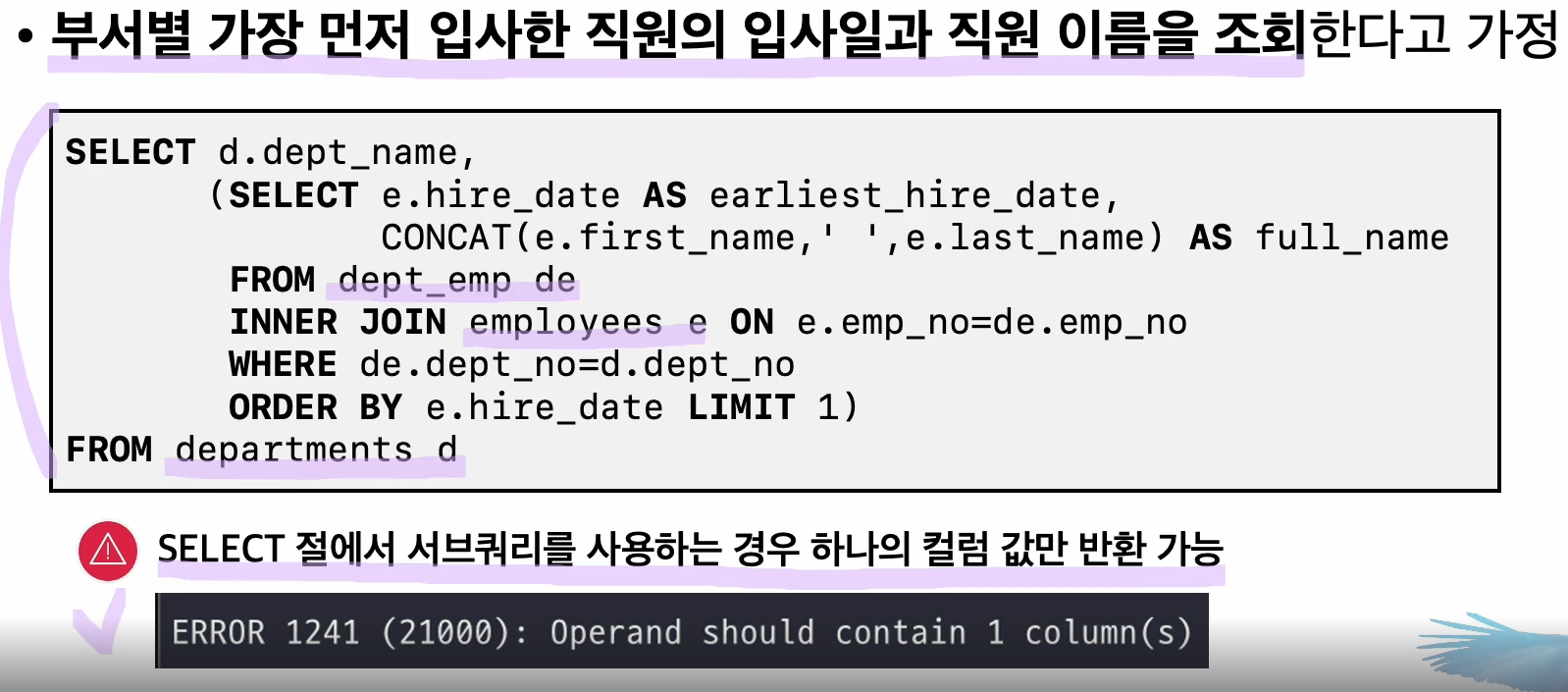 select 에서 subquery를 활용하는 경우 1개의 column만 반환해야 하는데 위예시에서는 hier_date, concat(name) 을 반환하려고 하고있어서 에러가 난것이다.