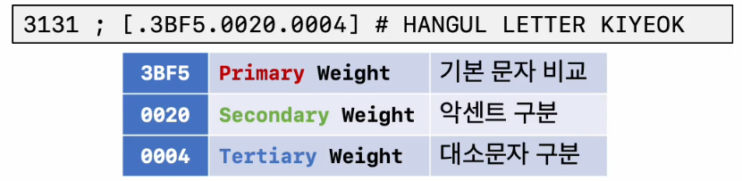 - DUCET(Default Unicode Collation Element Table) 에 정의된 가중치 값을 바탕으로 비교