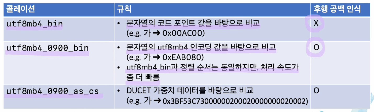 기본 콜레이션인 (utf8mb4_0900_ai_ci)는 오른쪽처럼 다양한 형식들이 다 같은것으로 인식되는 문제가 있다.