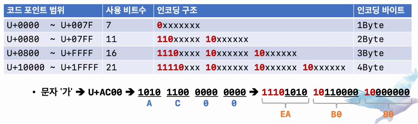- 예시) 일반적으로 많이 사용되는 UTF-8 인코딩 방식이다.
