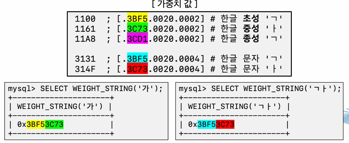 - WEIGHT_STRING( ) 함수를 통해 문자열의 가중치 값 확인 가능