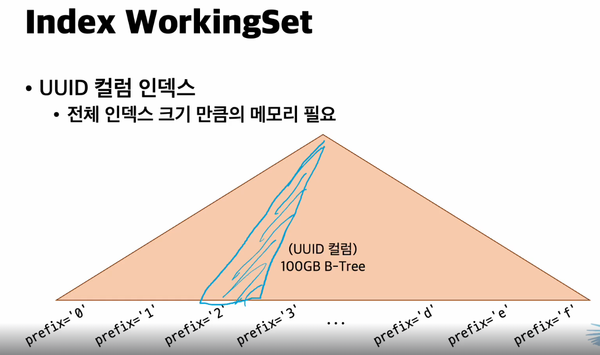 보통 2년전의 데이터보다 최근 3개월 정도의 데이터가 훨씬 더 빈번하게 쓰인다. 하지만 UUID는 매번 랜덤한 값을 생성하기 때문에 prefix가 매번 달라질 수 있다. working set이 넓어진다고 볼 수 있다.