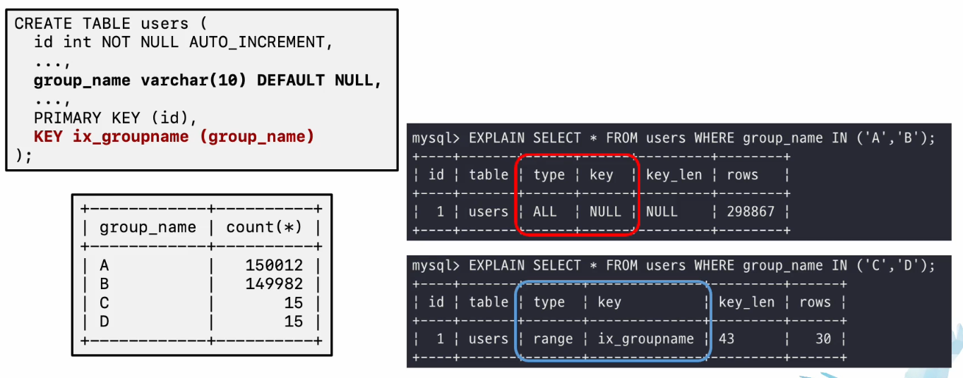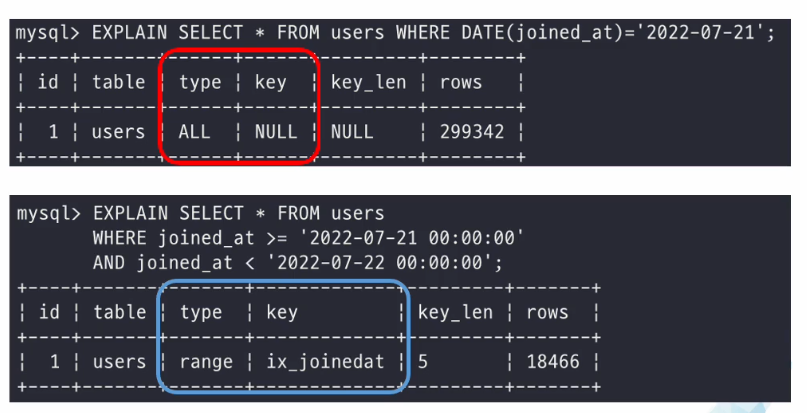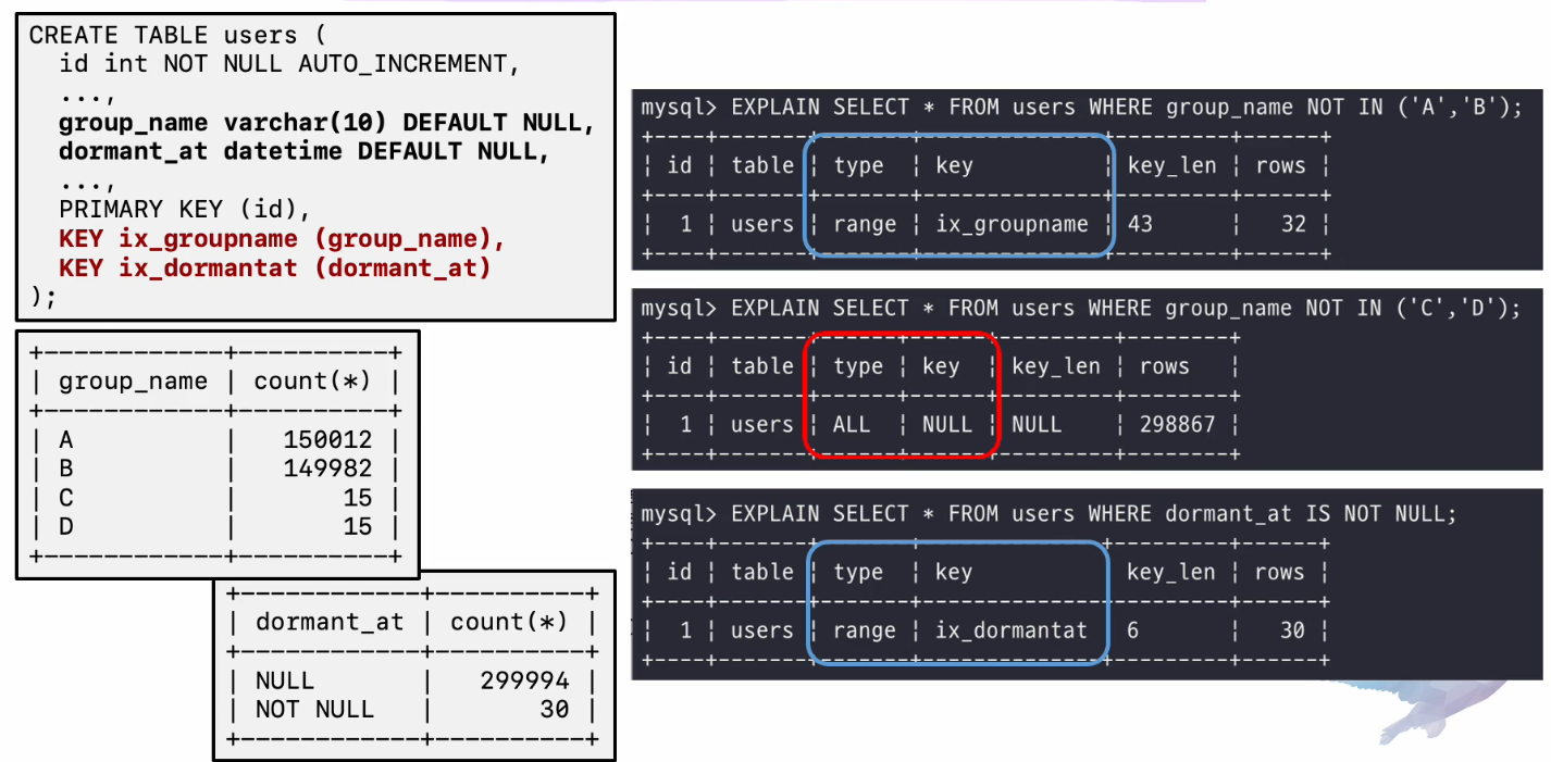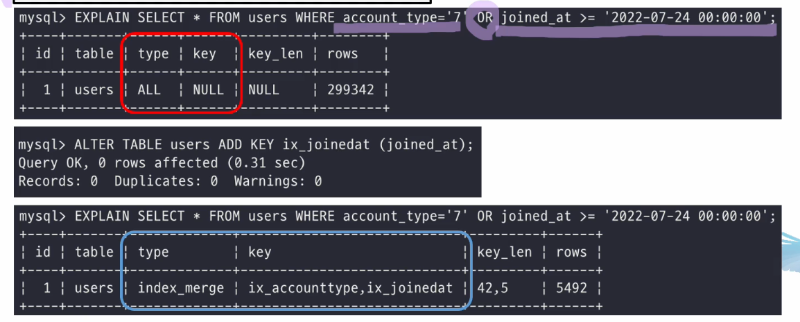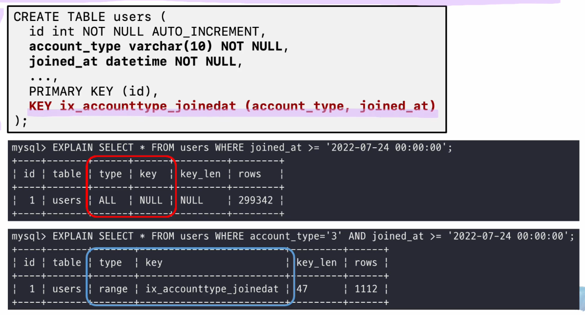 joined_at column이 인덱싱에 포함되지 않은 컬럼이었을때 OR연산을 수행시에 account_type이 인덱싱이 되어있더라도 쿼리 실행계획은 인덱스를 타지 못하게 된다.