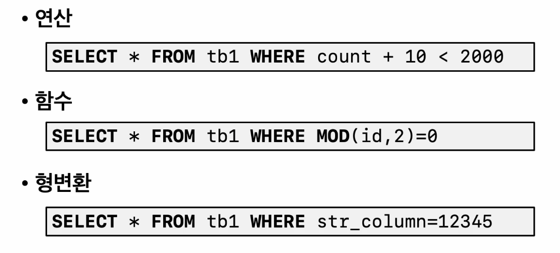 해당 컬럼이 인덱스에 존재하더라도 쿼리에서 인덱스를 활용하지 못한다.
