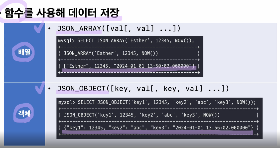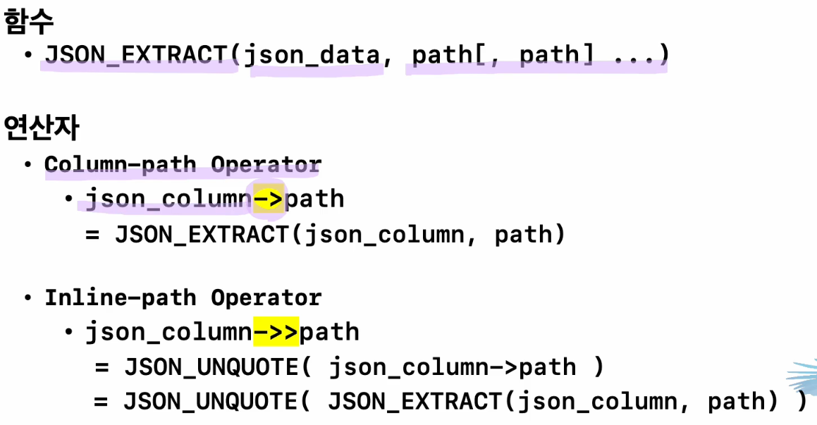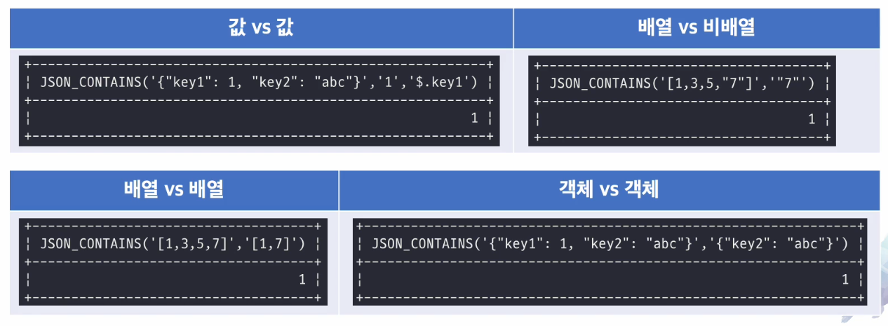 - JSON_INSERT , JSON_REPLACE , JSON_SET , JSON_REMOVE 등등 존재한다.