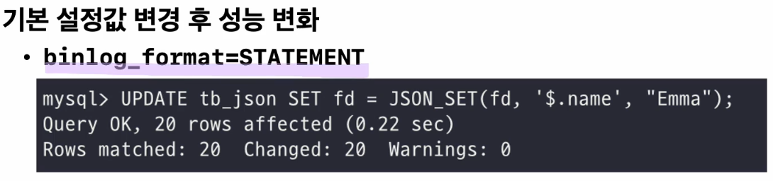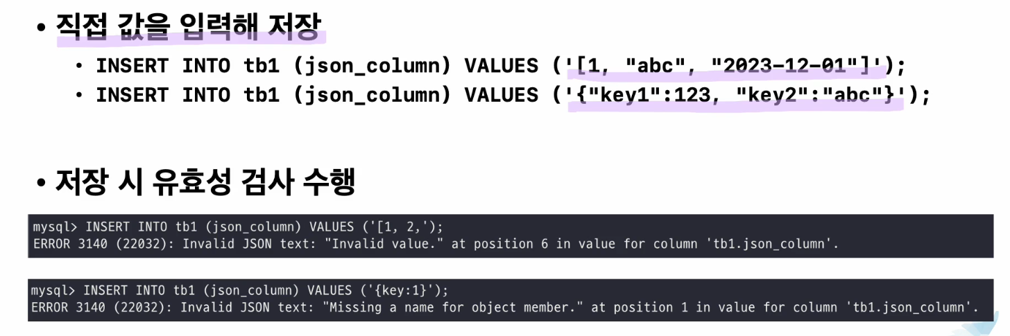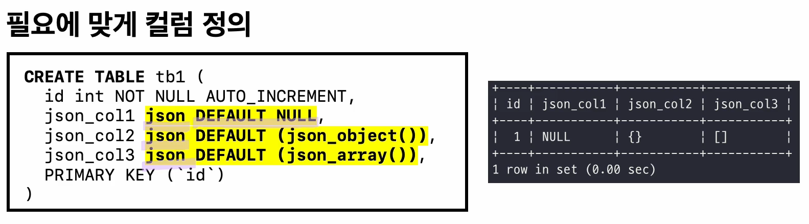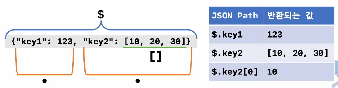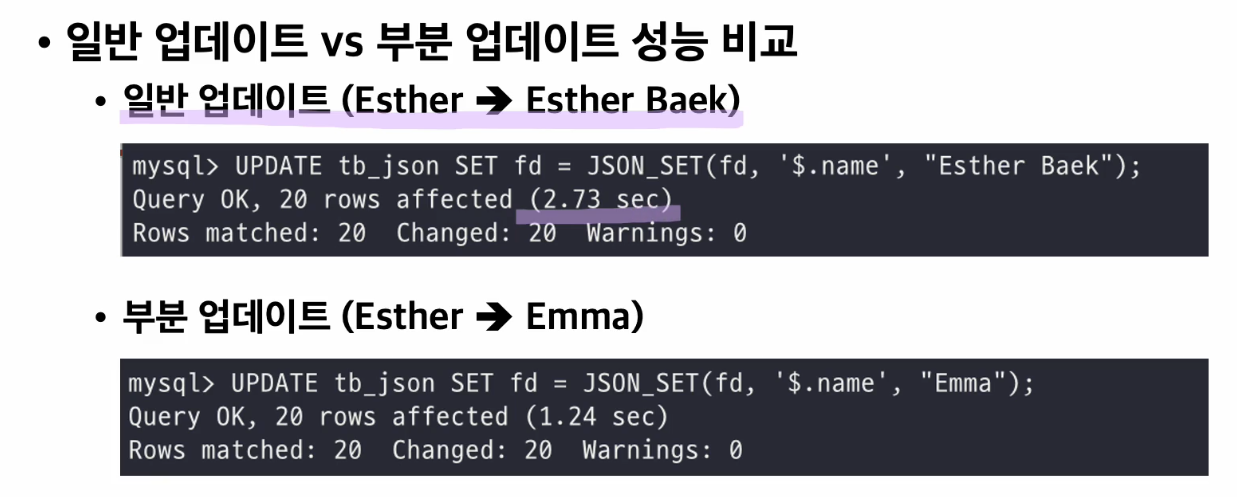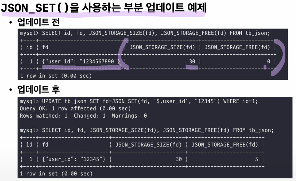 - JSON_SET() , JSON_REPLACE() , JSON_REMOVE 함수만 가능하다.