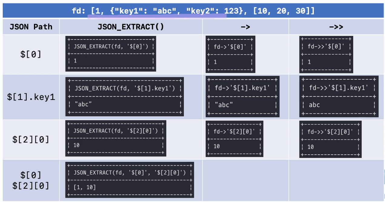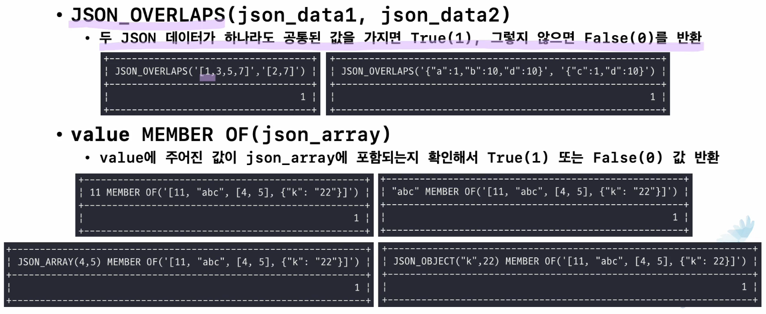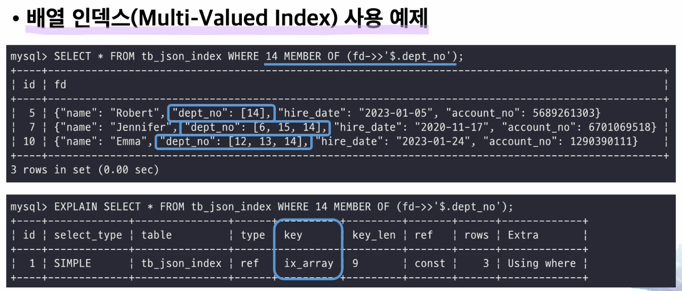 - MEMBER OF , JSON_CONTAINS , JSON_VOERLAPS 함수만 배열 인덱스 사용이 가능하다.
