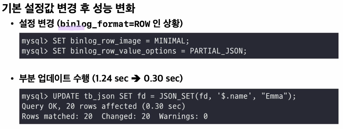 Partial JSON Logging: When set to PARTIAL_JSON, MySQL will log only the modified parts of a JSON document, rather than logging the entire JSON object each time it is updated. This can lead to significant savings in binary log size, especially for large JSON documents where only a small part of the data changes frequently.