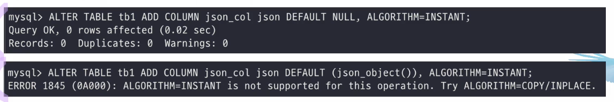 default 가 null이 아니면 instant 알고리즘으로 DDL이 불가능하다.