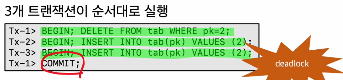 - tx2,3 pk=2레코드에 대해서 동시에 x-lock 획득 대기