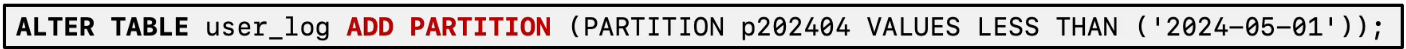 - 파티션 추가 /삭제시 잠금 (메타데이터 락) 이 발생하므로 , 가능하다면 트래픽이 적은 시점에 수행한다.