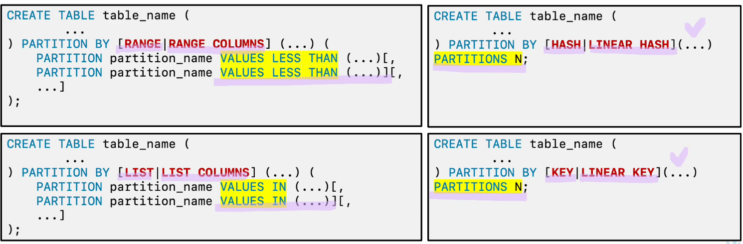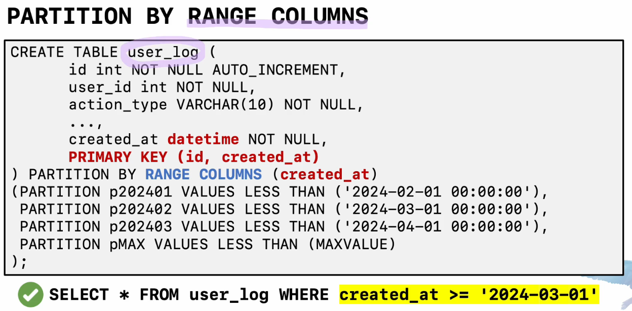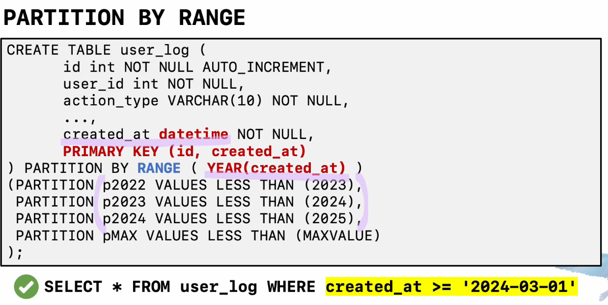 - 쿼리가 특정 날짜 범위의 데이터를 요청할 떄, MySQL은 조건 범위에 해당하지 않은 파티션은 쿼리 처리에서 제외 가능하다.