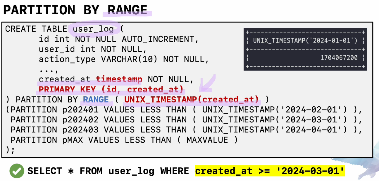 유닉스 타임스탬프 함수를 사용하면 반환되는 결과 값이 타임스탬프 값으로 정수 값이기 때문에 range 타입으로 파티셔닝이 가능하게 된다.