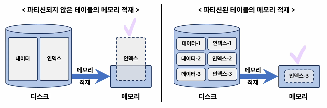 위 예시도 파티션이 되지 않은 경우에는 인덱스 전체를 메모리에 옮겨와야하지만 파티션이 된 경우 쿼리 범위에 해당되는 인덱스 만 메모리에 옮기면 된다.