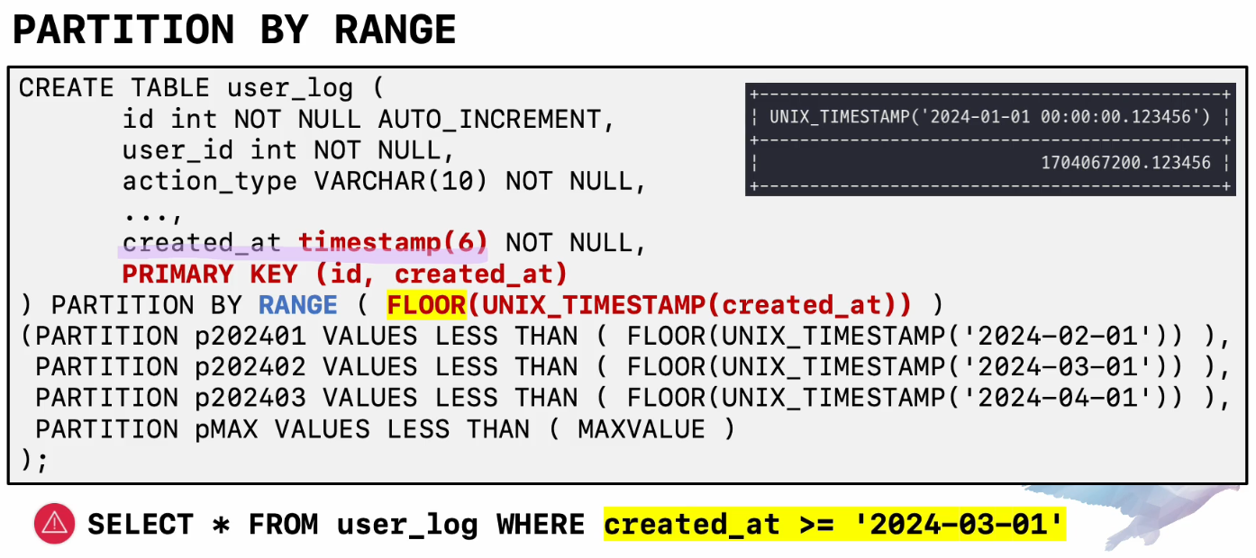 Range Columns 같은 경우에는 정수뿐만아니라 다른타입도 지원함으로 그대로 created_at을 사용하였다.
