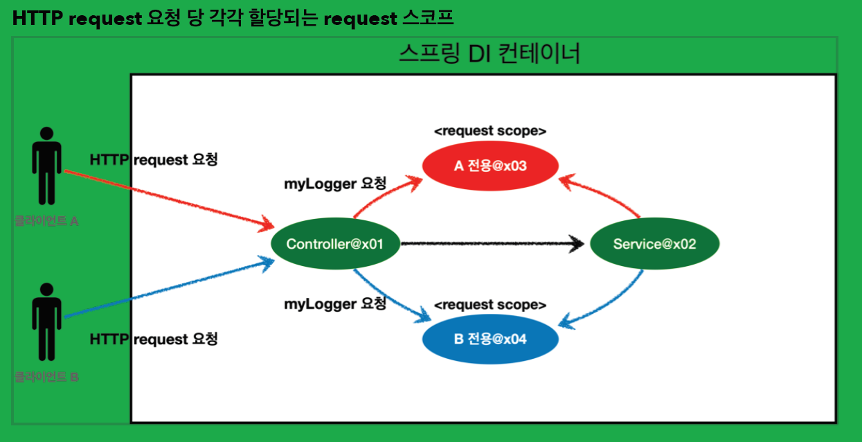 myLogger 는 HTTP 요청 당 각각 구분되므로 다른 HTTP 요청 때문에 값이 섞이는 걱정을 하지 않아도된다. scope가 request이기에.