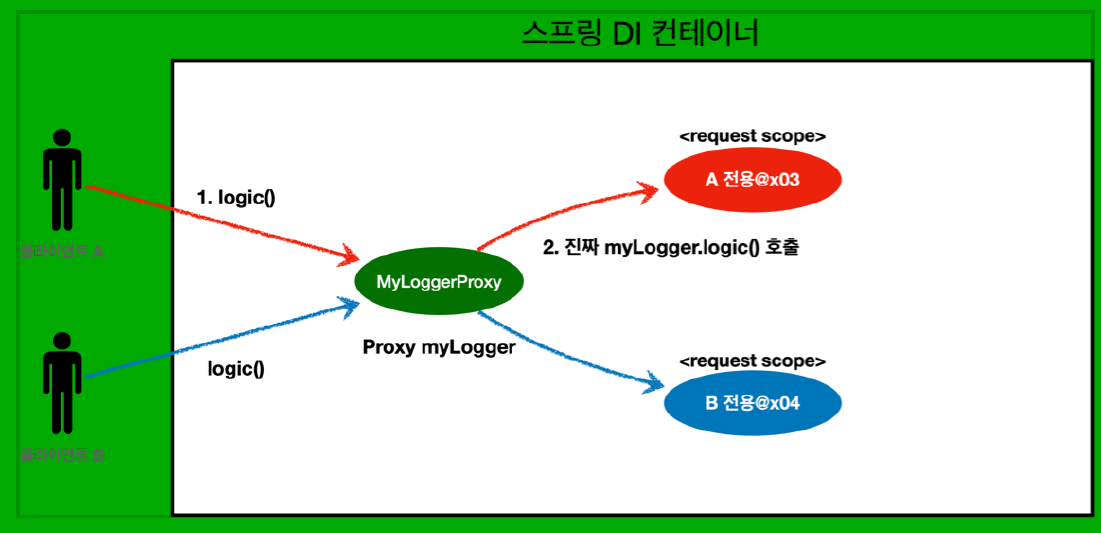 이렇게 하면 MyLogger의 가짜 프록시 클래스를 만들어두고 HTTP request 와 상관 없이 가짜 프록시 클래스를 다른 빈에 미리 주입해 둘 수 있다.